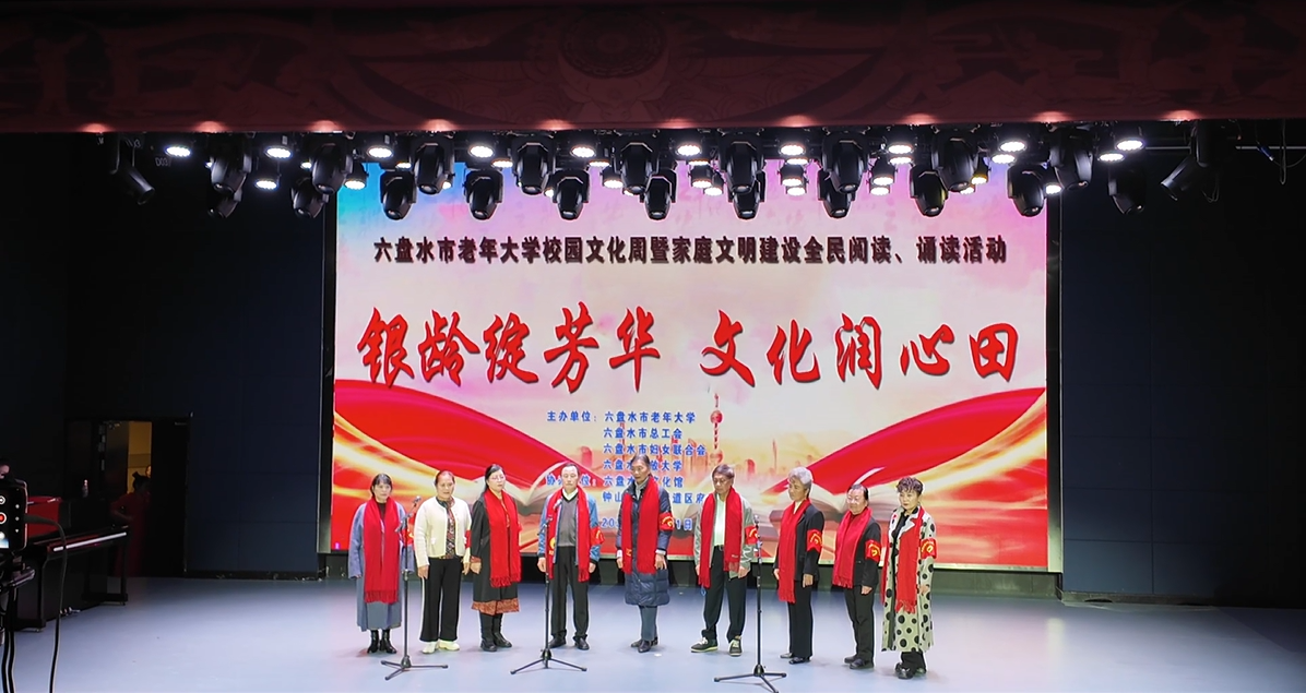 10月31日下午,六盘水市文化馆小剧场内书香袅袅、暖意融融,“银龄绽芳华 文化润心田”校园文化周暨家庭文明建设全民阅读、诵读活动在此温情启幕。老年学员们以“银龄先锋 老教有为”为主题,用饱含深情的诵读致敬流金岁月,传递银发力量,让文化的温度在剧场内静静流淌。