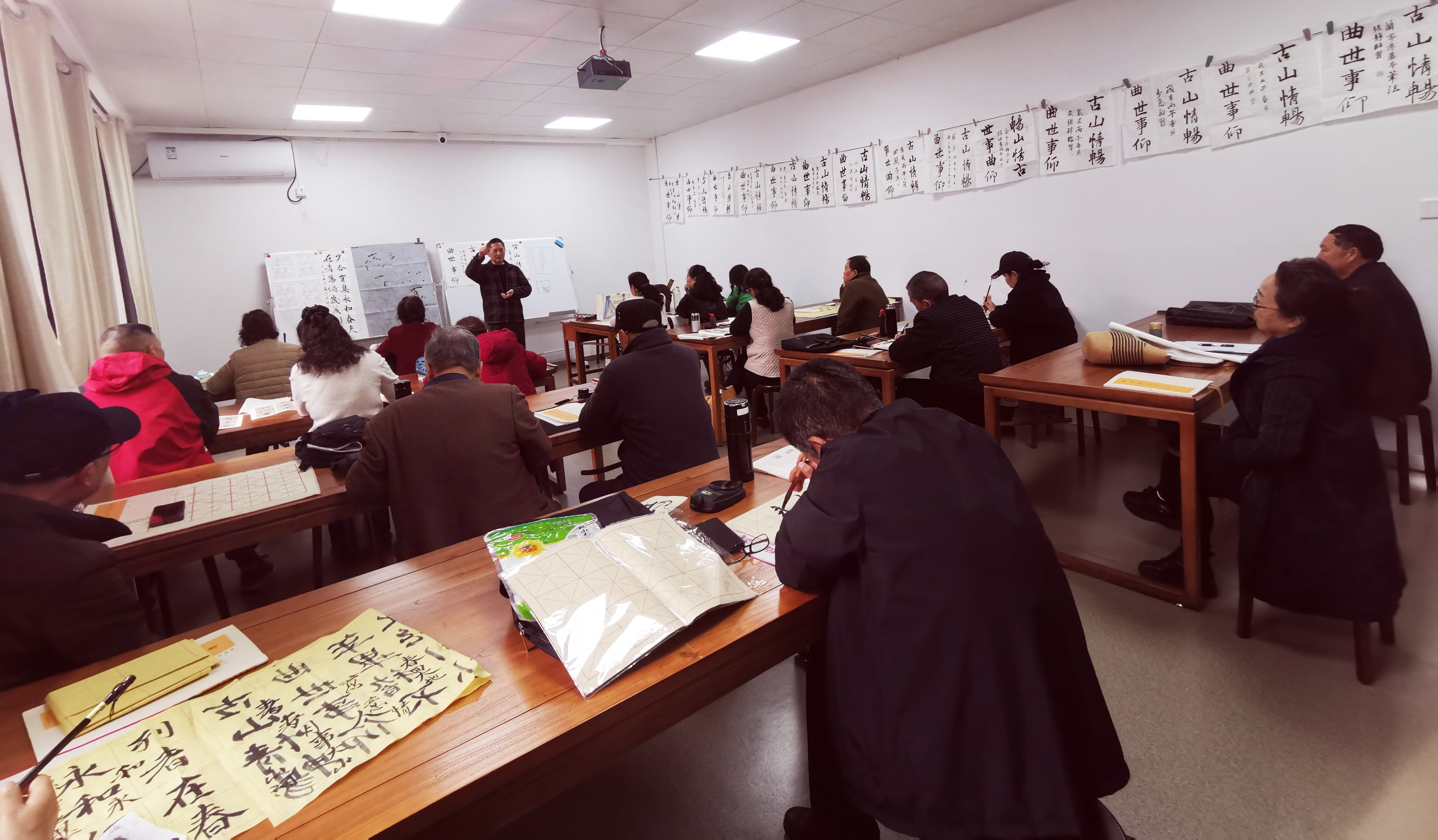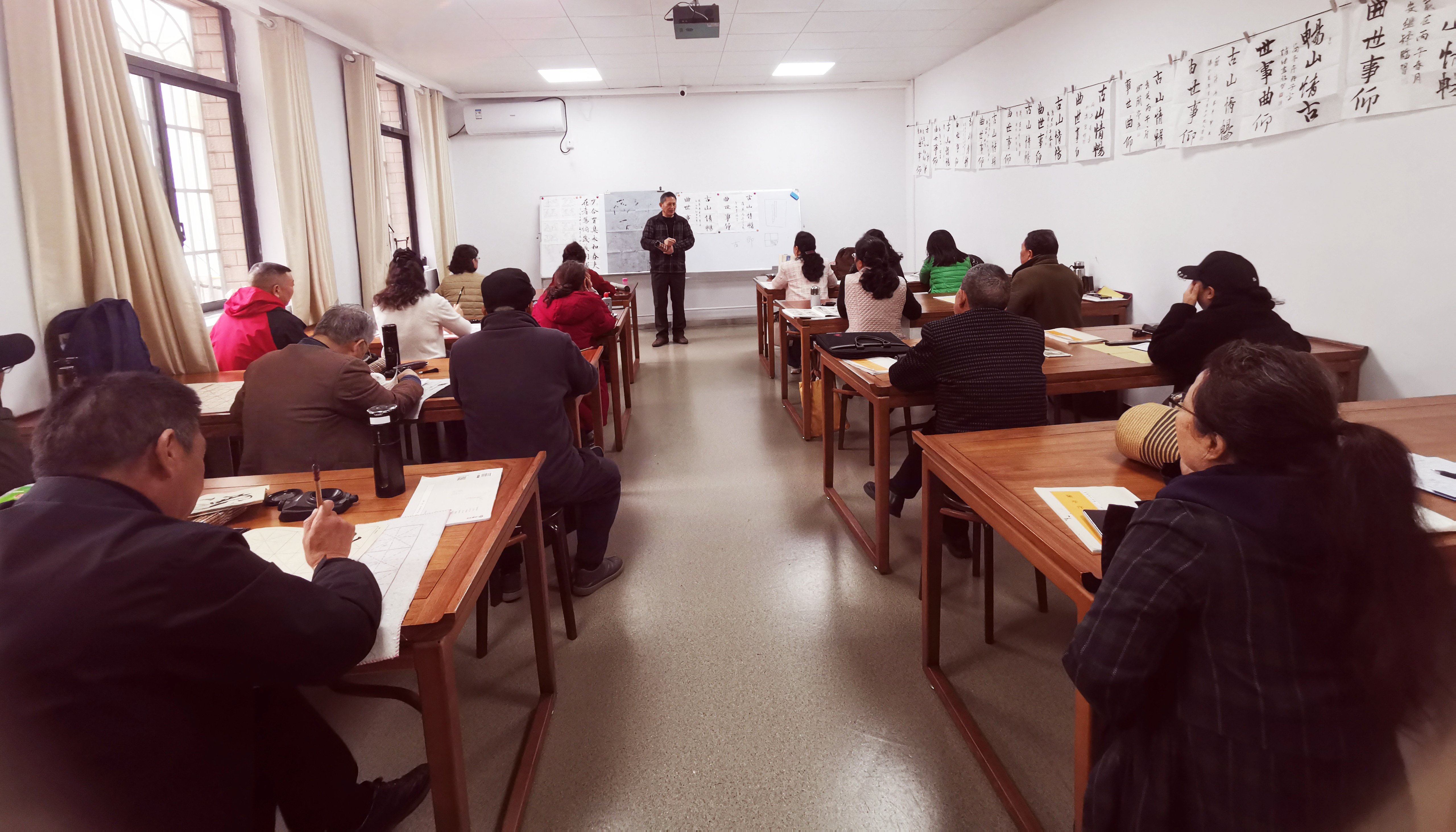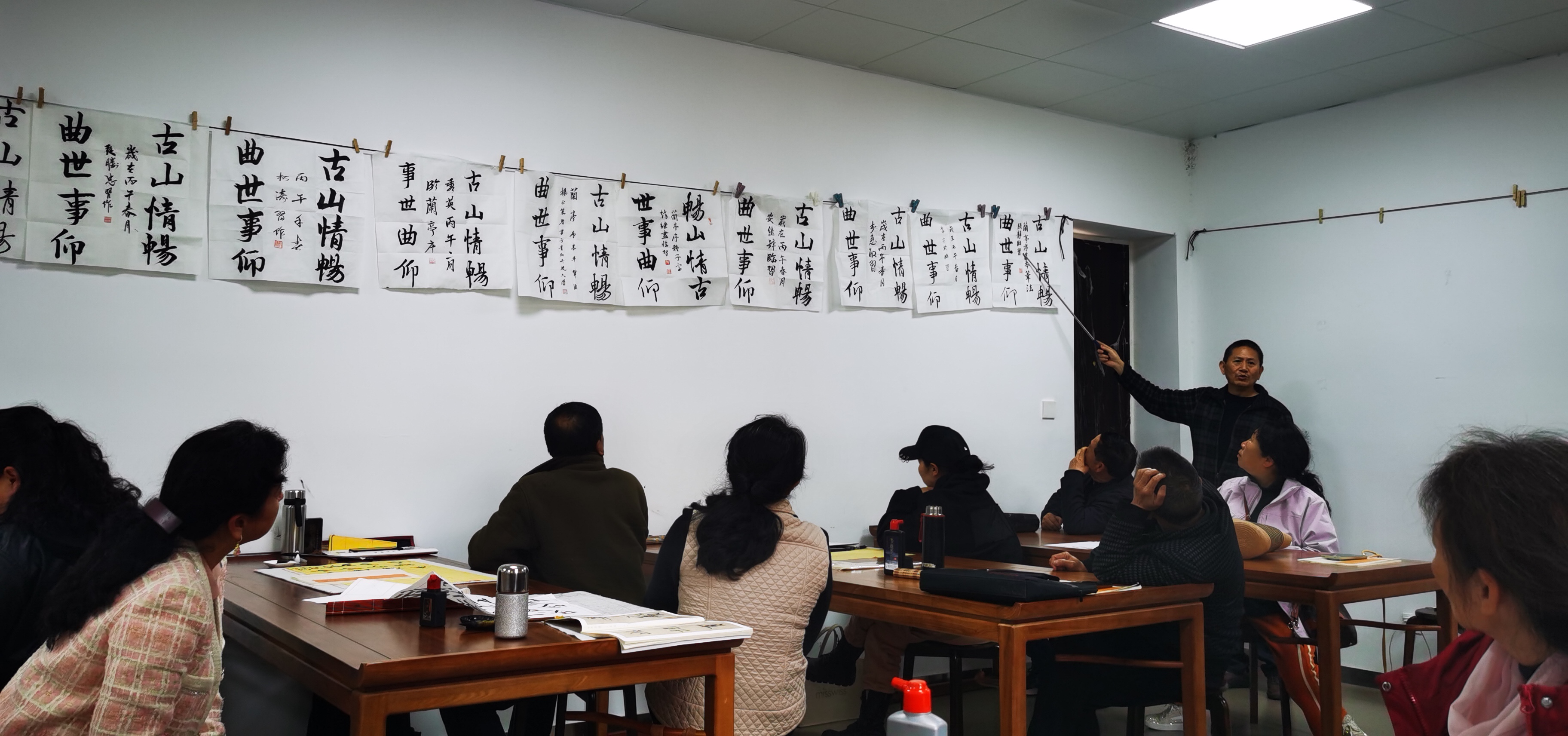 这是星期三上午,丁爱洲老师的书法班的上课现场,师风严谨,班风和乐有序,每一次上墙的作业点评,都让我们在书法学习的路上向前了一步